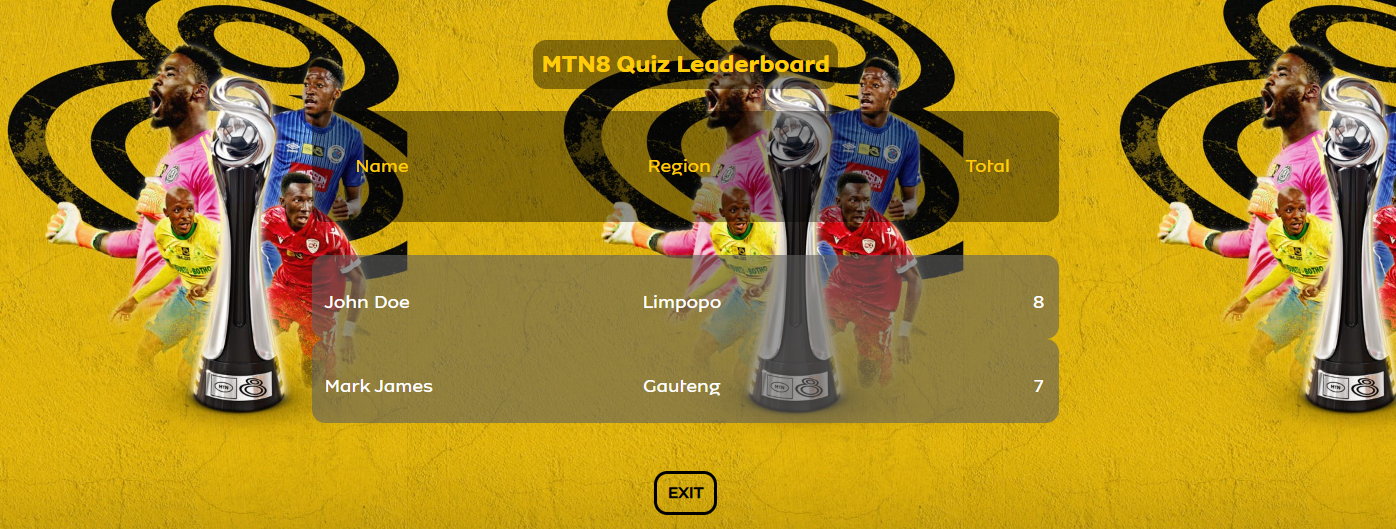 This project successfully delivered an engaging and interactive web app for the MTN 8 competition, combining a multiple-choice quiz with a dynamic leaderboard to foster user participation and competition. By prioritising speed, usability, and scalability, the app effectively handled high user engagement, providing a seamless experience. This endeavour not only met its objectives but also demonstrated the potential of leveraging technology to enhance fan interaction in sporting events.
